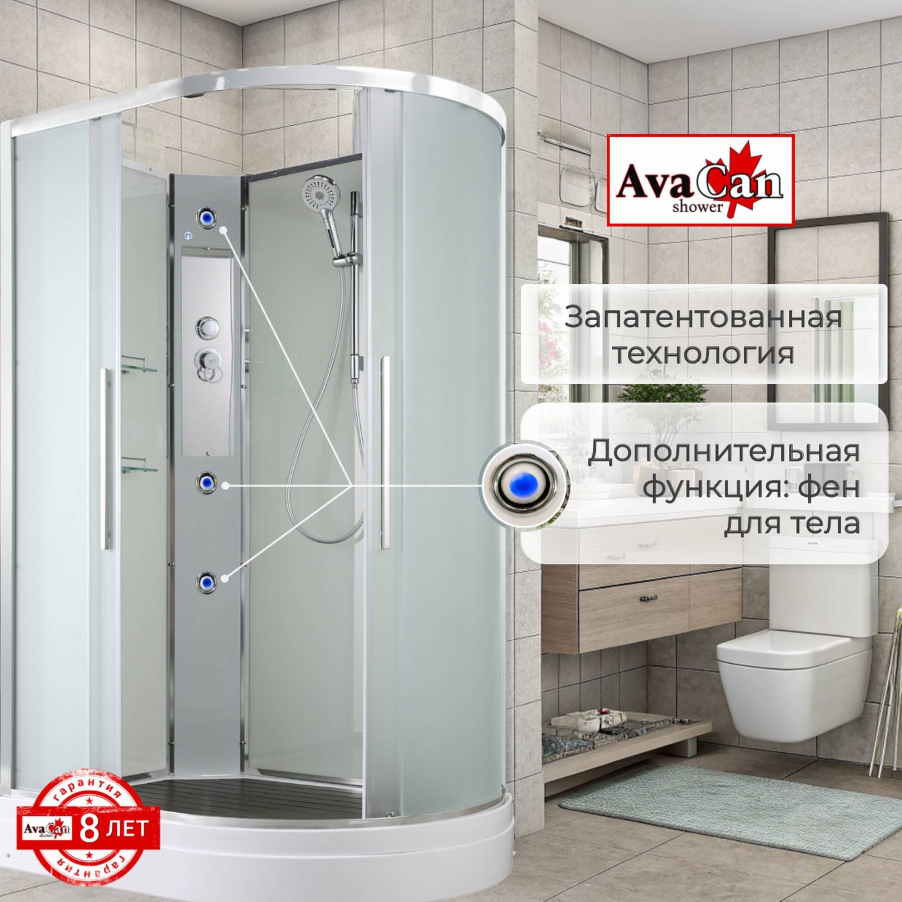 Стильная душевая кабина AvaCan EM2811LN сочетает в себе высокую функциональность, практичность и надежность. При изготовлении применяется безопасное закаленное стекло толщиной 5 мм (матовое), надежно фиксируемое алюминиевым профилем. Сборка без силикона (увеличивает срок службы), внутренняя сборка(облегчает установку и ревизию; позволяет установить в ограниченном пространстве), смеситель резьбовой (без хомутов). Съемный экран поддона (позволяет осуществлять ревизию сифона). Цвет профиля  хром. Двойные металлические ролики дверей (увеличивают срок службы).В комплекте : душевая штанга, две полочки , арома-лейка с витамином С (картридж съемный),полимерная вставка в поддон(имитация дерева),сифон, ручки дверей из нержавейки , двойные ролики .