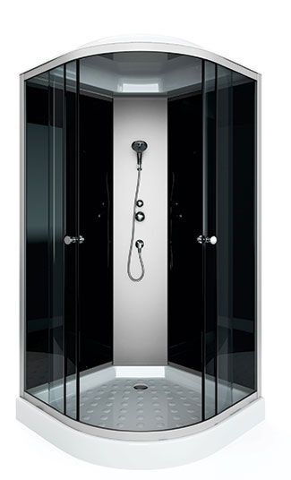 поддон низкий 15см фронтальные стекла: тонированные задние стекла: черные задняя панель: пластик серебро хромированный алюминиевый профиль регулируемые ролики хромированные ручки для дверей 2- режимный смеситель ручная лейка слив с сифоном крыша с верхней лейкой