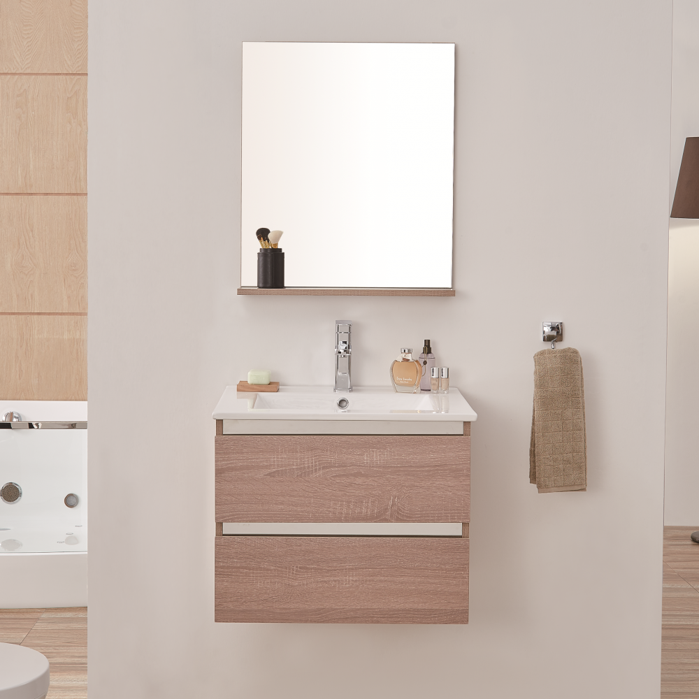 . Многослойное дерево 2. Два выдвижных ящика с доводчиками 3. Цвет: темный дуб . 4. Зеркало с полкой. 5.Раковина в комплекте.