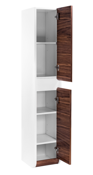 Серия VISION: Модульная система с натуральным шпоном Базовые элементы системы - Напольные пеналы (для бокового монтажа) - Арт. VSN000P-L (Левый): 310 ? 1600 ? 346 мм - Арт. VSN000P-R (Правый): 310 ? 1600 ? 346 мм ----------------------Ключевые характеристики Параметр Значение Конструкция Модульная (комбинируется тумба + пеналы) Корпус Влагостойкий МДФ с эмалевым покрытием Фасад Натуральный шпон лиственных пород Тип установки Подвесной (тумбы), напольный (пеналы) Система хранения 1 выдвижной ящик (в тумбе) + пеналы с полками Толщина МДФ До 20 мм (усиленная прочность) Нагрузка ящика До 40 кг (специальная фурнитура) Поверхность Полуматовая с текстурой древесины Цвета • Фасад: Дуб (натуральный шпон)• Корпус: Белый Фурнитура Полностью выдвижные ящики, регулируемые системы ----------------------Преимущества серии - Высокие пеналы (160 см) для хранения вертикальных предметов.? Гигиеничность: Подвесной монтаж тумб облегчает уборку.