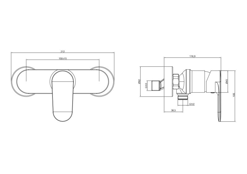 • Однорычажная система регулировки силы струи и температуры воды