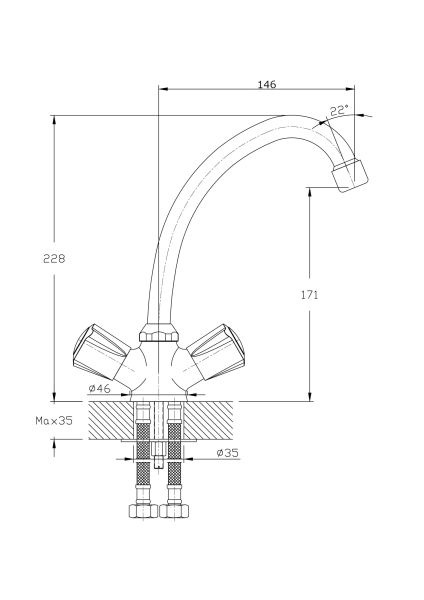Смеситель для кухни с высоким, поворотным изливом RUSH арт. PI7950-22 с металлической ручкой из коллекции Pioneer изготовлен из высококачественной латуни и имеет вентильное управление.В смеситель установлены кран-буксы (RSH502) с керамическими пластинами. Высота смесителя 228 мм. Излив поворотный (360гр), 146 мм. Высота излива до аэратора 171 мм. Аэратор изготовлен из пластика с нержавеющим корпусом, угол наклона - 22 гр. В комплекте универсальная присоединительная группа (шпилька-2шт), гибкая подводка с латунными гайками 35см - 2шт, фум-лента, индивидуальный пакет, паспорт, гарантийный талон.