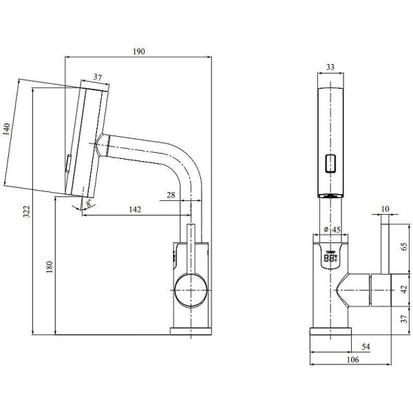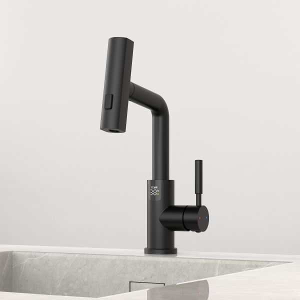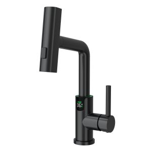 Смеситель для раковины датского производителя Black&White в черном матовом цвете. В корпусе изделия прослеживаются нотки классических форм и современного стиля. Изготавливается из сантехнической латуни для увеличенного запаса прочности и исключения вероятности появление коррозии. Управление потоком воды осуществляется с помощью керамического картриджа повышенной пропускной способности. Инновационным решением можно отметить электронное табло, расположенное в нижней части корпуса, на которое выводится показание температуры воды с подсветкой красного, зеленого и синего цвета. В данном продукте реализован многофункциональный излив с возможностью настройки высоты и длинны с помощью вытяжного шланга. Аэратор смесителя оборудован несколькими видами подачи воды, которые переключаются с помощью кнопки расположенной сверху корпуса.