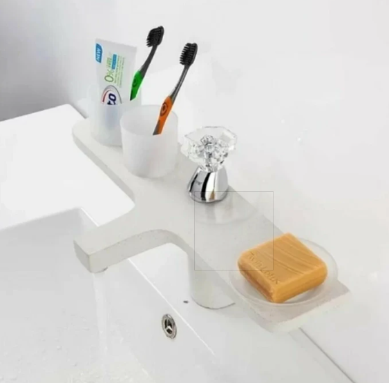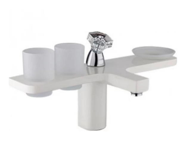 Смеситель для умывальника Gappo Giron G1096-7 — оригинальная однорычажная модель в комплекте с аксессуарами. Корпус выполнен в виде полочки, рычаг управления в форме кристалла расположен по центру. Модель изготовлена из латуни и кварцевого камня. В комплекте аксессуары для ванной комнаты: два стакана и мыльница. Цвет смесителя — красный.