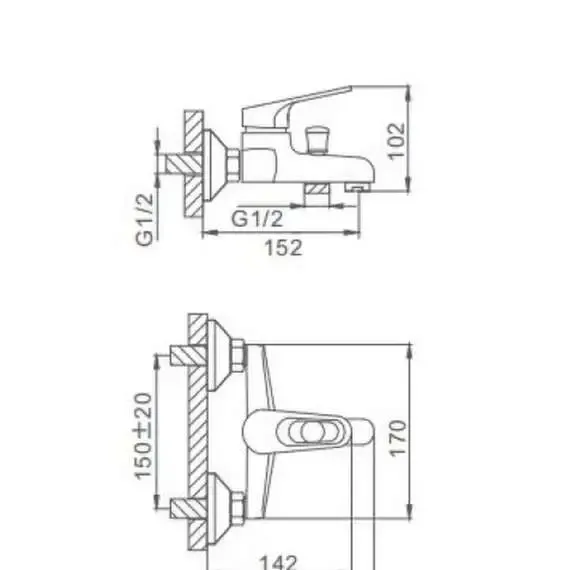 Смеситель для ванны латунный хромированный. Однорычажное управление, стационарный короткий излив с установленным аэратором, переключение с излива на душ при помощи штока, керамический картридж 35 мм. Смеситель укомплектован душевой лейкой с одним режимом, душевым шлангом длиной 1,5 м, отражателями и набором эксцентриков. Присоединительный размер 1/2, монтаж настенный на два отверстия.