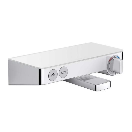 Смеситель Hansgrohe Ecostat Select 13151400 для ванны с термостатомХарактеристики продукта:-2 потребителя-возможно одновременное включение 2 потребителей (душей)-предохранительный ограничитель при 40°C-из безопасного стекла-поверхность полочки: хром или белый