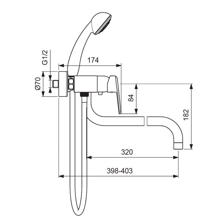 BALANCE Настенный смеситель для ванны/душа, поворотный излив 320 мм, душевой гарнитур в комплекте (душевая лейка Ø70 мм, металлический шланг 1500 мм, держатель для лейки).