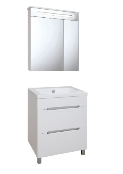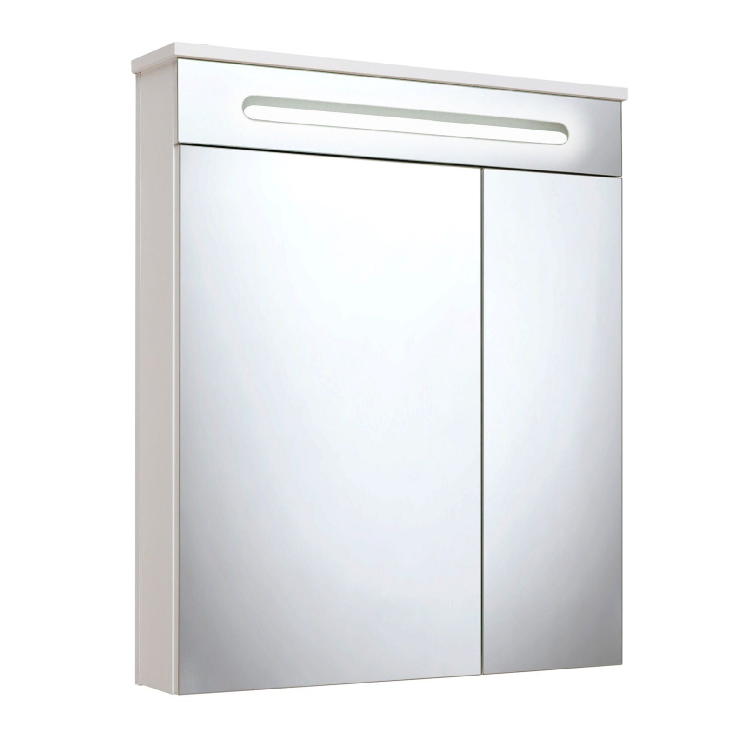 Зеркальный шкаф со встроенной сверху люминесцентной подсветкой и двумя отделениями с зеркальными фасадами. Внутри - две встроенные полки. Блок розетка/выключатель расположен внутри шкафа. Петли со встроенным доводчиком.